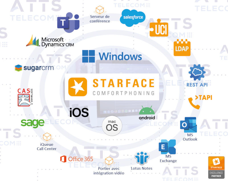 ATTS TELECOM, les fonctionnalités dépassent largement la téléphonie. Et les APIs et autres connecteurs spéciaux vous permettent de relier votre système téléphonique STARFACE avec vos logiciels CRM et ERP.